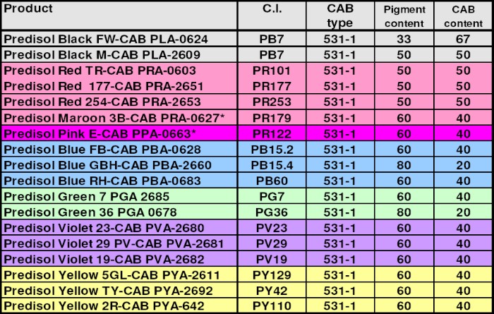 Predisol 顏料分散色精的開發目的乃是提高顏料的展色特性及縮短塗料製造時間,由於顏料的充分分散展現出高度透明性耐UV性及高艷度等特性,主要應用範圍包括汽、機車、腳踏車塗料、皮革塗料、木器塗料及電子三C製品塗料等
